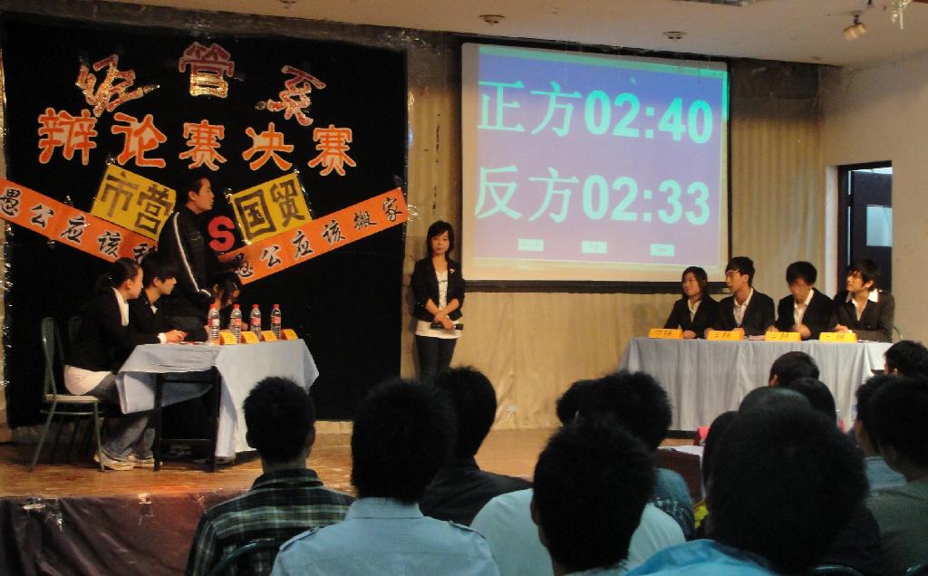 本次辩论赛以市营专业作为正方阐述“愚公应该移山”的观点,国贸专业则作为反方阐述“愚公应该搬家”的观点,双方在开篇立论的精彩陈述后,又展开了激烈的攻辩和自由辩论。正方着重强调愚公敢于面对眼前困难,勇于坚持不懈的精神。对此反方则以寻求解决问题的最佳方法为突击点,双方唇枪舌剑,各不相让。辩论赛中辩手们绝佳的口才、灵敏的思维、巧妙的作答赢得了在场观众声声不息的赞叹以及阵阵掌声。
