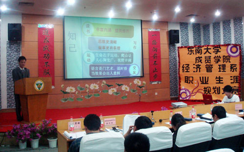 此次大赛吸引了全院四百余名学生参与,最终从复赛的四十名学生中选拔了六名选手进入总决赛。决赛过程精彩纷呈,掌声不断,评委从专业知识、职业特点、发展前景等角度对选手提问,选手们从容应对、巧妙接招,充分展现了成贤学子积极进取、奋发向上的风采。最终来自08国贸2班的选手王玮获得本次大赛的冠军。南京高新管委会劳动人事处马达处长做了精彩点评。他肯定了大赛的组织工作和选手水平,希望广大学生认清现实,踏实刻苦地完成学业,寻求更好的发展。