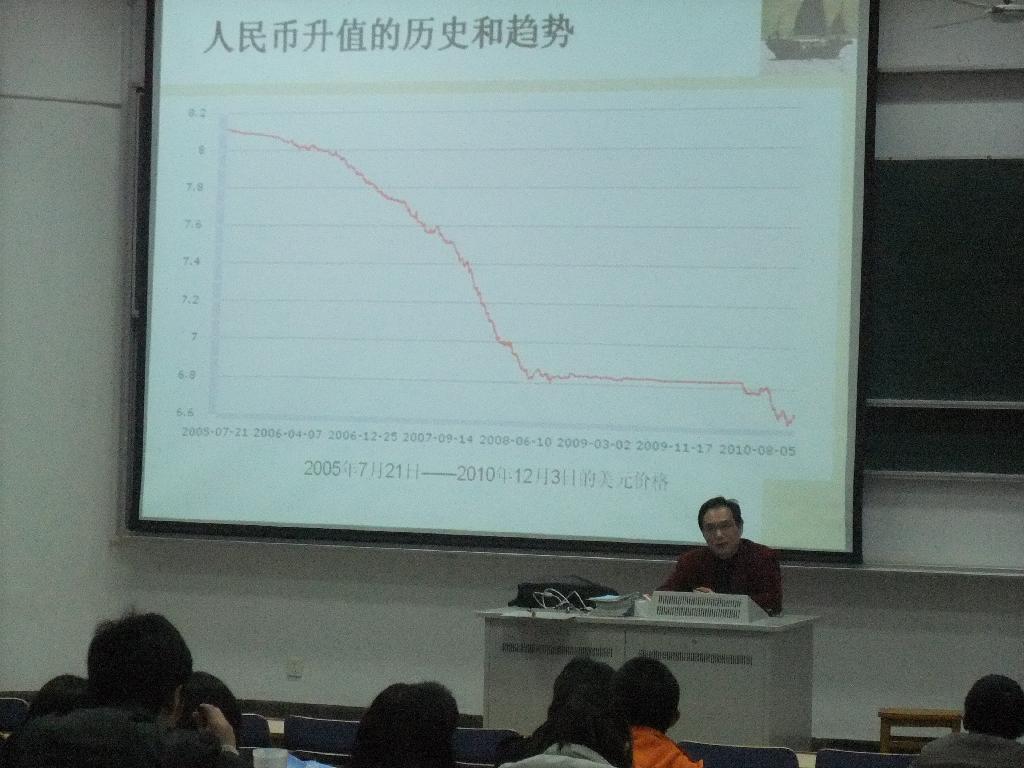 此次讲座有幸邀请到beat365正版唯一官网必一beat365正版唯一官网必一经济贸易系徐力行副教授担任主讲人。在为时两个小时的讲座中,徐教授从人民币升值的历史和趋势、人民币升值的利弊、人民币升值的价值和原因以及对策讨论,这四个方面分别阐述了人民币汇率的变动趋势及其对人们生活的影响,给同学们上了一堂非常生动的经济研究课。同学们听得津津有味,无不沉浸其中,徐教授的精彩演讲也赢得了同学们的阵阵掌声。
