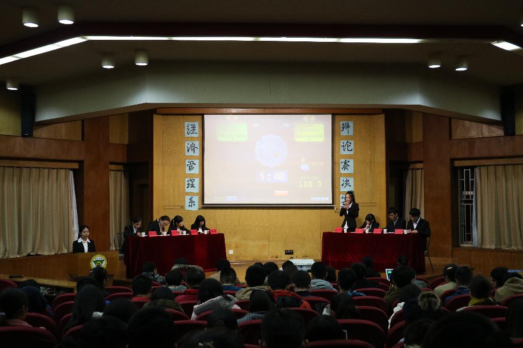 2015年11月24日晚,由经济管理系分团委学生会学习实践部举办的系辩论赛决赛在真知馆隆重举行,由电商对阵物流。到场嘉宾及评委有:辅导员徐小瑛老师、苏珍晶老师、胡钱胜老师,院辩论队教练代玉学姐、陈体杨学长、钱晶晶学姐,院辩论队主力韩也逸学长,沈昕学长。此次辩题是:爱情在暧昧不清时最美还是在情真意切时最美。