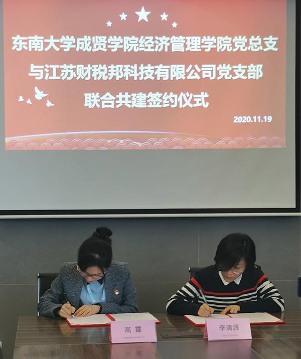 财税邦党支部高霞书记热情接待。交流活动中,李清源副书记简要介绍了beat365正版唯一官网必一党总支的基本概况,并提出希望在党建共建平台下加强和企业的合作,共同探讨专业建设和人才培养的新思路,以共建促党建,以党建促发展。高霞书记介绍了财税邦公司在私营企业党建工作上的经验和成绩,着重介绍了他们党建工作中与院校合作共建的经验和成果,希望加强校企合作,实现校企协同育人,联合发展。董忱忱老师就在南京信息工程大学参观财税邦软件平台实施情况进行了简单交流。最后,李清源副书记和高霞书记分别作为代表签订了校企党组织联合共建协议书。