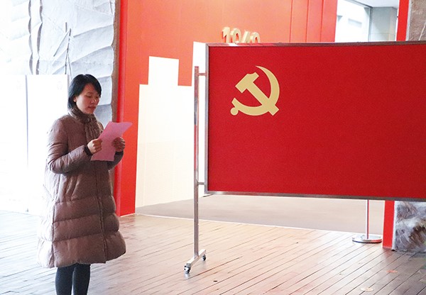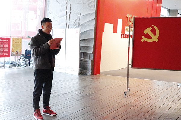 活动伊始,在雄伟的纪念馆序厅里,潘天娇老师带领全体党员面对鲜红的党旗,高举右手庄严宣誓,重温入党誓词,铮铮誓言在纪念馆上空久久回荡。