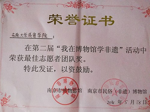 5月18日国际博物馆日,南京市博物总馆、南京市民俗(非遗)博物馆为beat365beat365正版唯一官网必一青年志愿者协会颁发“最佳志愿者团队奖”,以表彰志愿者们长期以来对博物馆工作的热心协助与支持。
