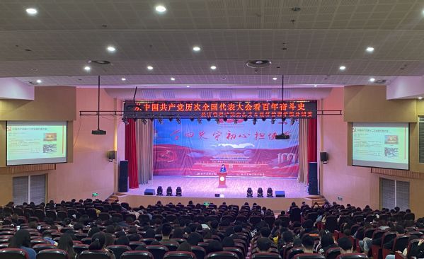 李清源副书记围绕“新时代学习党史的重大现实意义、中国共产党百年历史的发展脉络、中国共产党历次全国代表大会综述”三个方面,对百年党史进行了全方位解读。通过图文展示和史料说明,从新民主主义革命时期、社会主义革命和建设时期、改革开放和社会主义现代化建设时期以及新时代中国特色社会主义时期四个时间段对历届中国共产党全国代表大会的召开背景、召开时间、会议主题、历史意义和主要成果进行了详细的解读,带领全体师生一同领略波澜壮阔的中国共产党百年奋斗史。最后,李清源副书记希望同学们能够不断学习党的先进思想,树立正确的人生观,价值观和世界观;努力学习专业知识,提升自己的文化底蕴;坚持锻炼体魄,提高自身的身体素质,从党的百年辉煌历史中汲取前进的智慧与力量,将来为实现中华民族伟大复兴的中国梦贡献一份自己的力量。