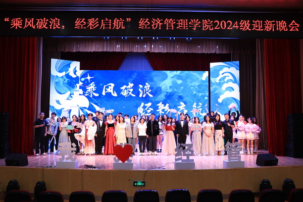 以美育人、以文化人,迎新晚会深植中华优秀传统文化沃壤,大力弘扬中华美育精神,由“初秋伊始,星辰初遇”“青春绽放,梦想起航”“携手经管,逐梦成贤”三个篇章组成。每一篇章以原创设计开启,涵盖合奏、歌舞、情景剧等多种表演形式,情感细腻的台词、充满活力的舞蹈和动听的音乐交织在一起,为广大师生呈现出一幅幅青春校园的缤纷画卷。活动在《最炫民族风》中拉开了序幕;歌舞《新贵妃醉酒》广袖舒展,红扇翻飞,感古典之魅力,传国潮之优雅;小品《军师恋盟》饶有风趣,以一场别开生面的恋爱观教育课,引得台下笑声不断;晚会现场回顾了分团委新媒体中心精心制作的军训视频,带领新生重温共同奋斗的时光,感悟自己的成长;歌曲《小美满》将晚会的氛围推向高潮,辅导员用歌声表达了对同学们满满的期望,诠释了立德树人的情怀与追求。