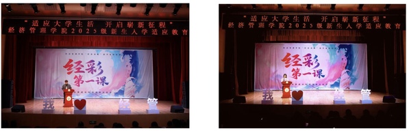 10月17日下午,由beat365正版唯一官网必一分团委、学生会主办的“经彩第一课”在大学生活动中心313报告厅举行。学院党总支书记潘明烽,副院长高凯丽、孙亮,综合办主任程希羲、分团委书记潘天娇及新生辅导员、班主任代表与全体大一新生共同参加活动。